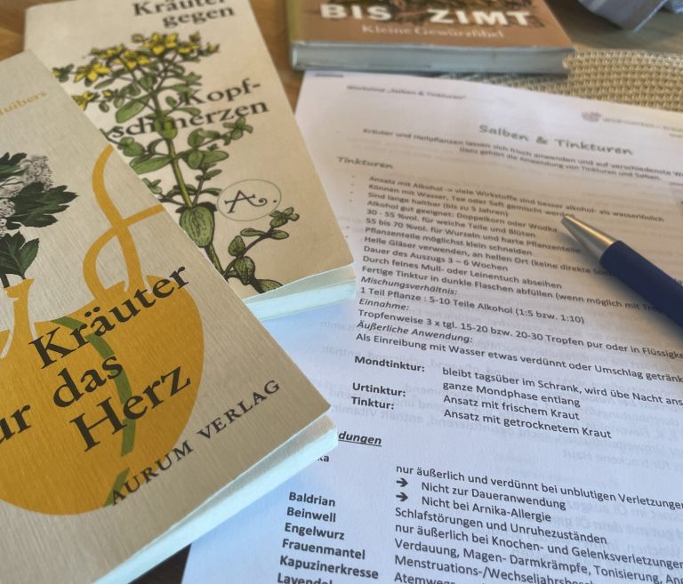 Außerdem können alle Teilnehmenden passend zum Thema ein unterstützenden natürliches Mittel herstellen (Tinktur, Salbe, Teemischung o.ä.) und mit nach Hause nehmen.